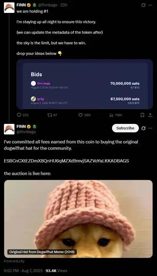 在这场竞拍中,另一个有力的竞争者是 @gr3gor14n。他的最高出价一度来到 6.6 比特币。他在 Twitter 上表示,他的计划是买下这顶帽子,然后把帽子戴在自己的狗的头上,并发射一个无捆绑的 $WIF2 币
