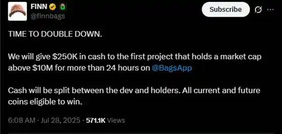 在今天上午,@finnbags 又发表推文,宣布将为 Bags 平台上第一枚突破 1000 万美元市值且保持 24 小时的 meme 币提供 25 万美元的奖励,获胜代币的 dev 和持有者都可以分享到这笔奖励。