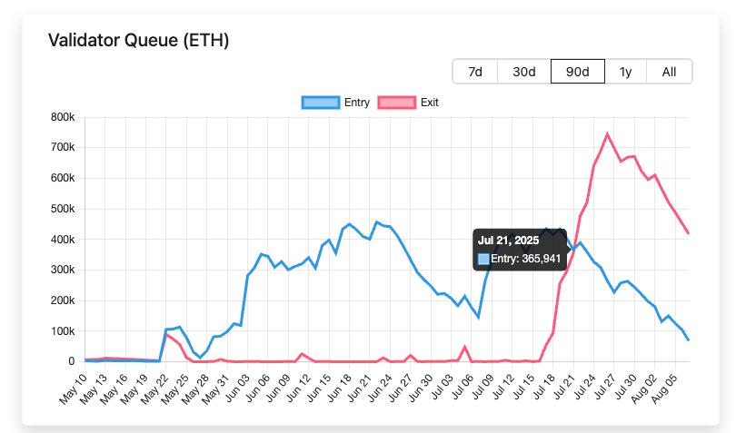 要理解机构的选择逻辑,我们需要先看一组数据:2025年7月21日起,ETH排队解除质押的数量开始明显高于进入质押数量,其中最大差值高达50万枚ETH。