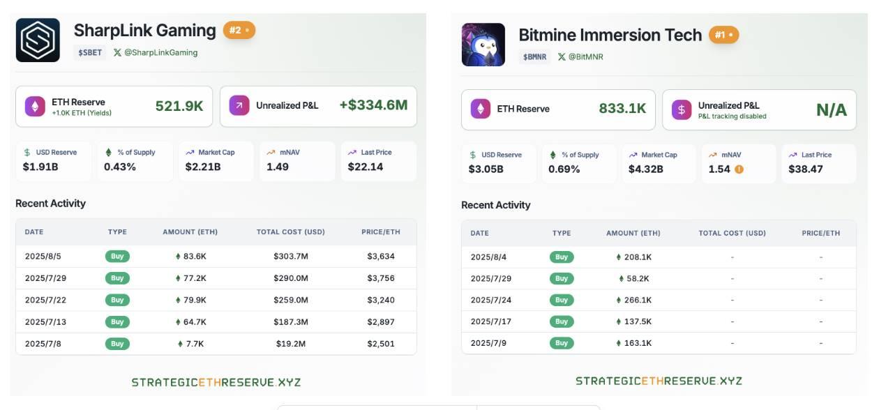 于此同时,以BitMine和SharpLink为首的ETH战略储备公司正在持续大批量购入ETH,当前仅这两家公司持有的ETH数量总和超过135万枚ETH。