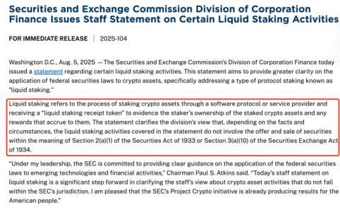 7月30日,SEC宣布收到贝莱德提交的ETH质押ETF申请。就在8月5日,SEC再次发布最新指引:特定的流动性质押不属于证券法管辖范围。