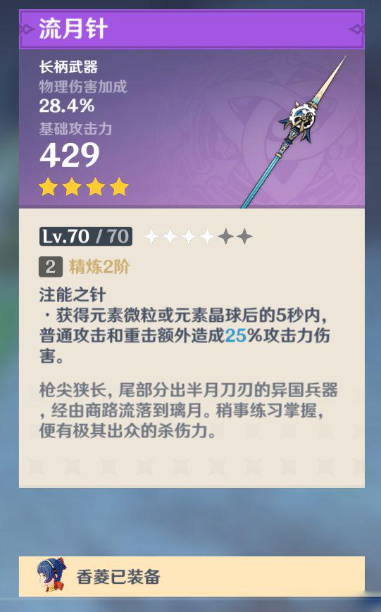 流月针满精炼的效果是每次攻击附加40%攻击力伤害,而香菱的普攻是9次,也就是360%攻击力伤害,近130%的普攻伤害加成,而且副属性为物理伤害,和攻击力,暴伤都是乘法叠加,对物理香菱来说比五星枪都要更强(每次看着比主伤害还高的附加伤害,我都在怀疑我是流月针发射器)。再看看那些加20%伤害的四星,一个个都是辣鸡,而且这个附加伤害也是可以暴击的,流月针,永远滴神。