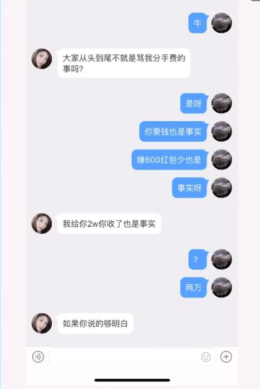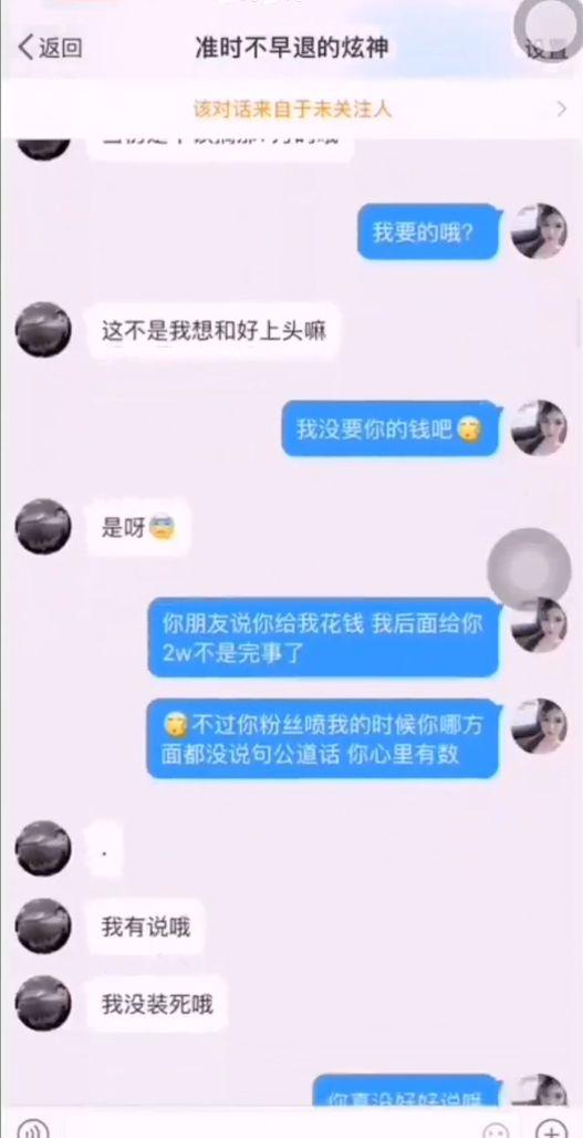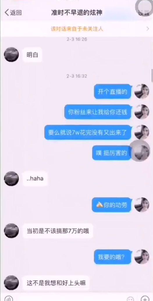 不难得出结论:炫神当时确实舍不得羊姐,于是给了羊姐7W想挽回关系,但是羊姐没要。不仅如此,分手后羊姐还把谈恋爱期间炫神给她的钱如数奉还。