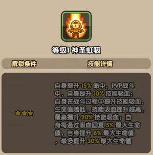 被动②:PVP战斗中,自身提升10%/20%/30%技能吸血,战斗过程中提升技能吸血,生命值越低,技能吸血提升越高,最高提升20%/25%/30%技能吸血
