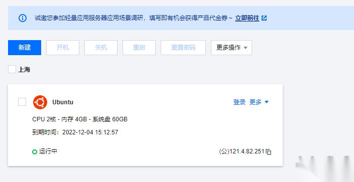 因为本地网络没有公网ip,因此需要借助云服务器,国内云服务器厂商很多,比较知名的有阿里云,腾讯云,华为云等等,这个教程使用的是腾讯云的轻量应用服务器,配置为2核4G6M月流量1000GB的,如果资金充足当然是配置越高越好了!