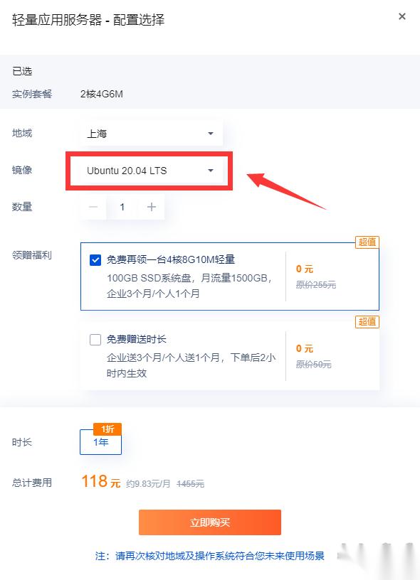 1、在选择系统镜像的是需要注意,选择 Ubuntu 20.04 LTS 其他参数默认即可
