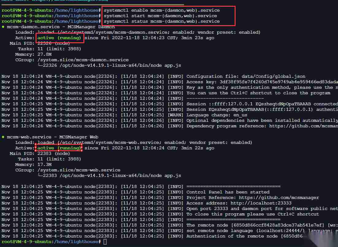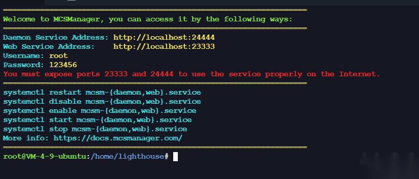 运行 MCSManager 服务:systemctl start mcsm-{daemon,web}.service