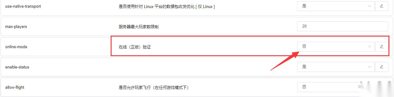 首先关闭实例,点击特定设置,选择第一个:[通用] server.properties,下滑找到:在线正版验证选择 : 否