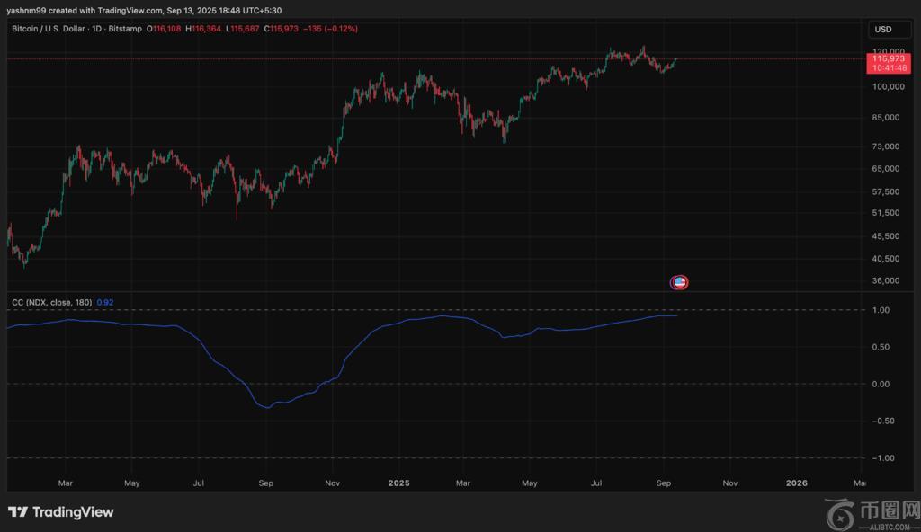 为了更全面地理解这一点,比特币价格相关性过去六个月,纳斯达克的持股比例已大幅增长至 92%。