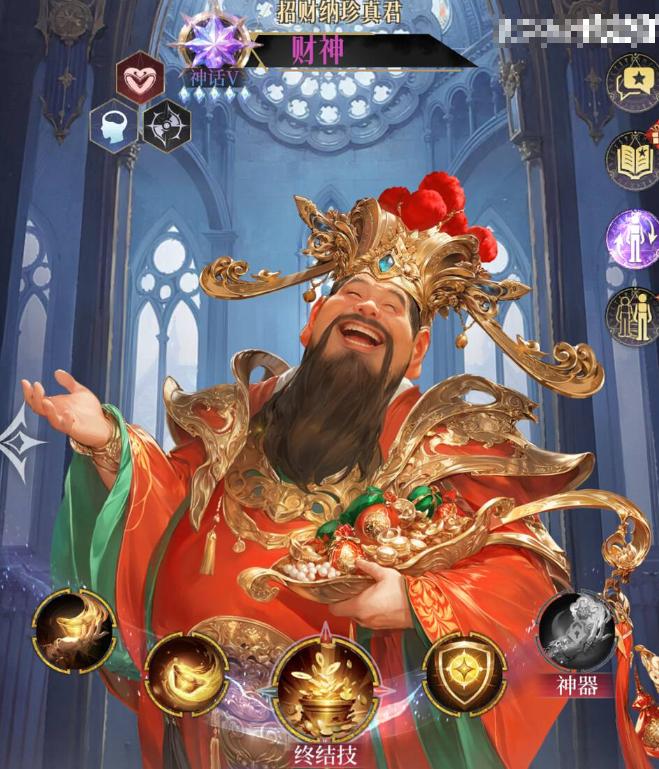 财神是治疗型辅助,如果没有可用同定位的其他神明代替;其可通过一技能给友方提供治疗,终结技、神器都可给友方提供回能,可提升宙斯的终结技释放频率。