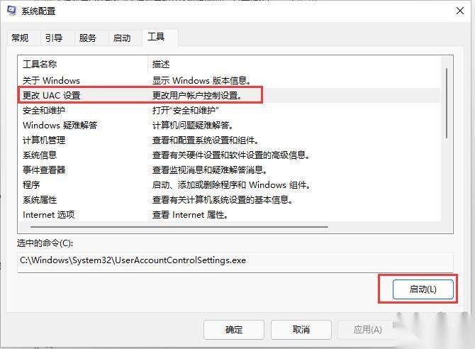 2、在工具下,我们选中更改UAC设置,然后点击下面的启动;