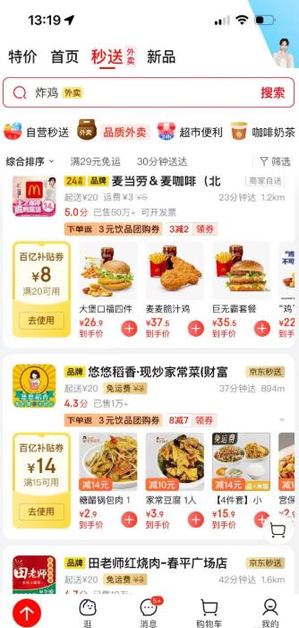 授权定位→ 系统会自动显示附近支持即时配送的商家(超市、餐饮、药店等)。