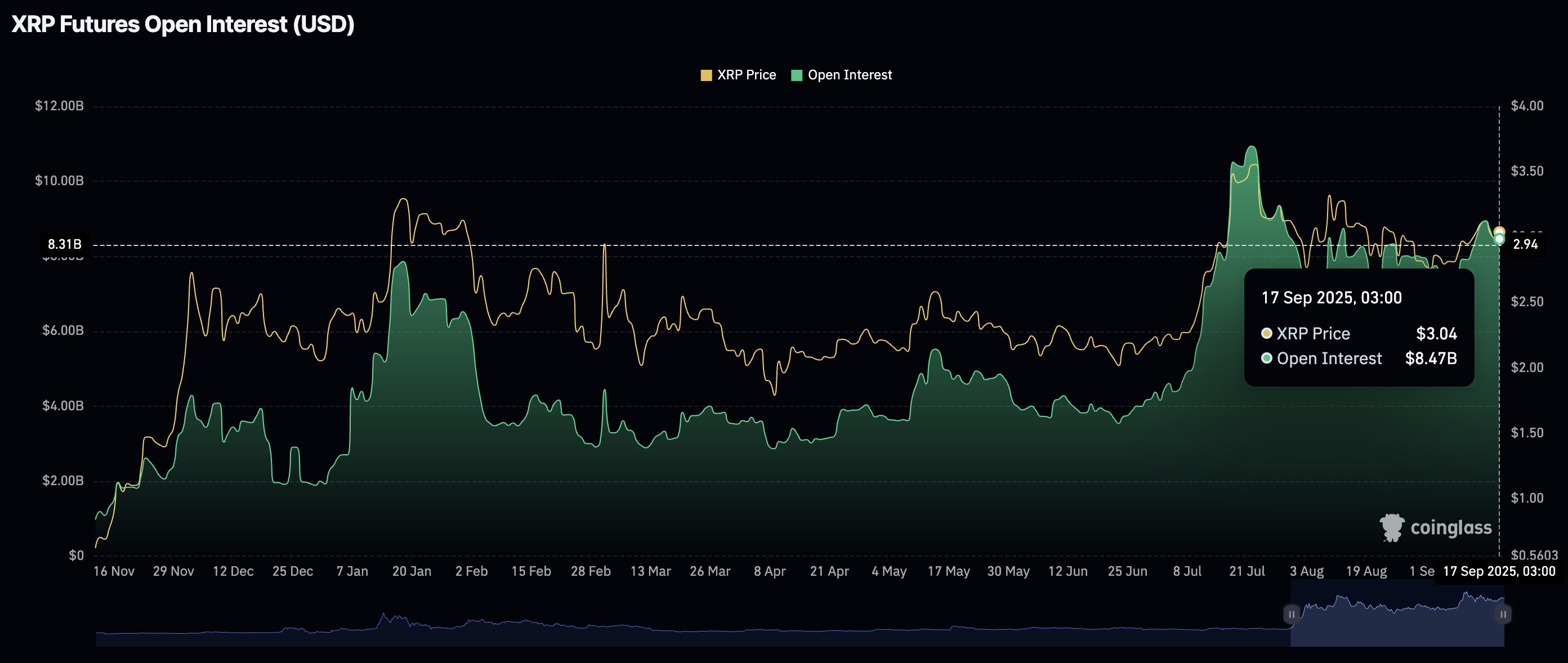 与此同时,零售对 XRP 的需求仍然相对较高,周三期货未平仓合约 (OI) 平均为 84.7 亿美元,高于 9 月 7 日的 73.7 亿美元。