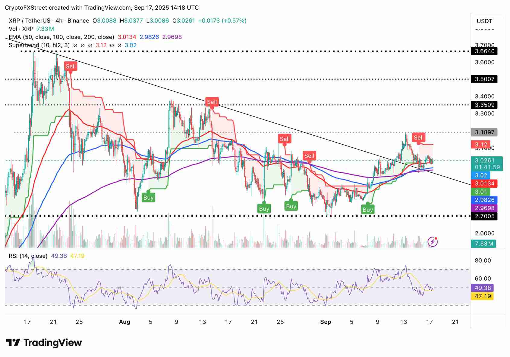 - 受美联储降息乐观情绪的支撑,XRP 仍保持在 3.00 美元以上。