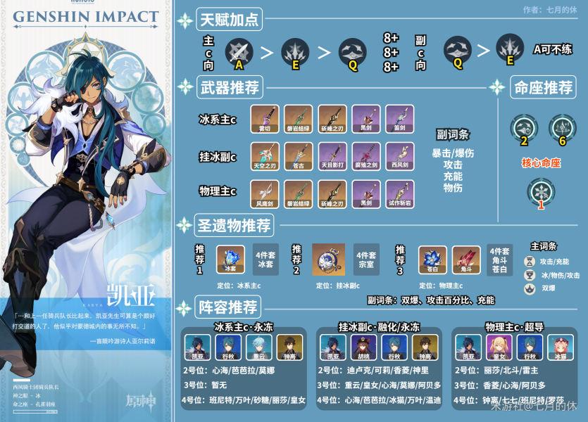 凯亚,冰系单手剑角色,定位主/副c。单手剑角色里普攻倍率第一,伤害说不上爆炸,但是也可以整普攻流玩法。作为主c,1命即毕业,副c随着命座的提升,能力越出色。