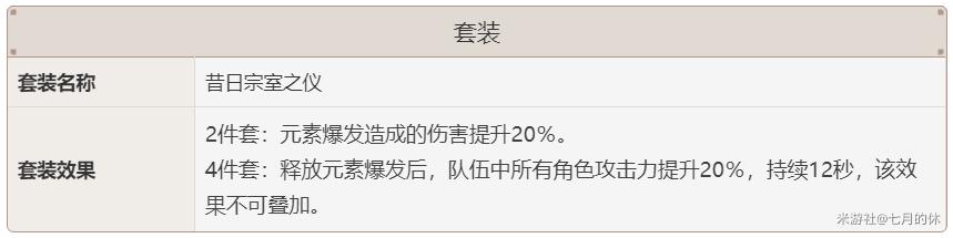 这是一套后台c兼辅助套,q技能伤害提升20%,且放q后,全队攻击力提升20%,持续12s。如果队伍里没有带宗室的,凯亚可以穿。(目前辅助、后台角色泛用性最高的一套圣遗物。)