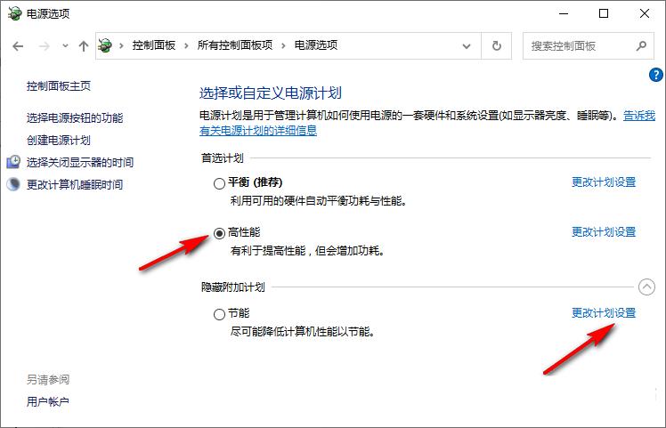 3、进入电源选项页面之后,我们在“首选计划”处选择“高性能”,然后在“隐藏附加计划”下点击“更改计划设置”选项,如下图所示。