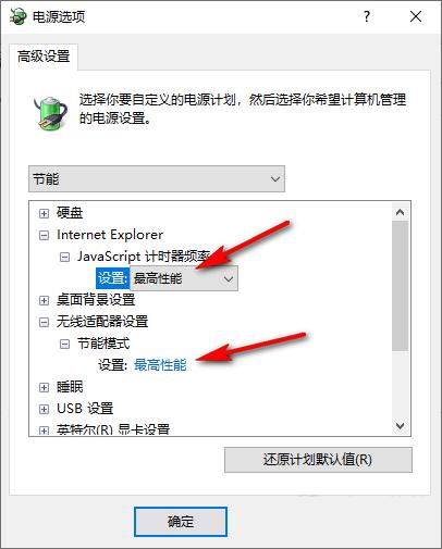 5、进入高级设置页面之后,我们先将“Internet Explorer”下的“ 计时器频率”设置为“最高性能”,然后将“节能模式”也设置为“最高性能”,如下图所示。