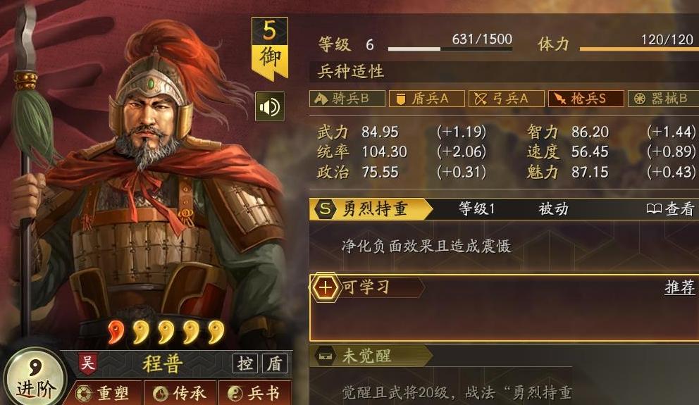 程普为吴国阵营的五星级别的武将,其兵种只有枪兵是顶级的,其技能控制能力在很多阵容中都有很大的作用,也是平民玩家比较好用的武将之一。自己的战法勇烈持重是一个受击才能其效果的战法,在被攻击时有20%的概率清楚自己身上的负面效果,比如中毒、虚弱和灼烧这种。并且能让敌方随机的一个武将陷入震慑状态,被震慑的武将无法进行任何自动。另一个战法克敌制胜是在普攻之才会触发的,触发后会有一次额外的谋略伤害,如果目标身上有中毒或者溃逃负面,这次的攻击还会让目标虚弱。这个战法搭配能提供中毒和溃逃状态的武将很好用,能将对方的输出牢牢控住。