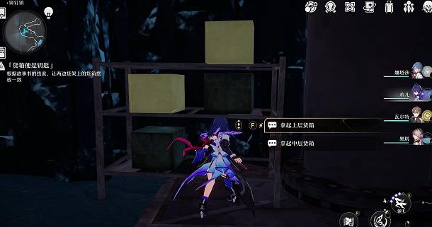 先拿起左边货架上的上层货箱,将其放置在右边货架的中层上,就可以解锁宝箱