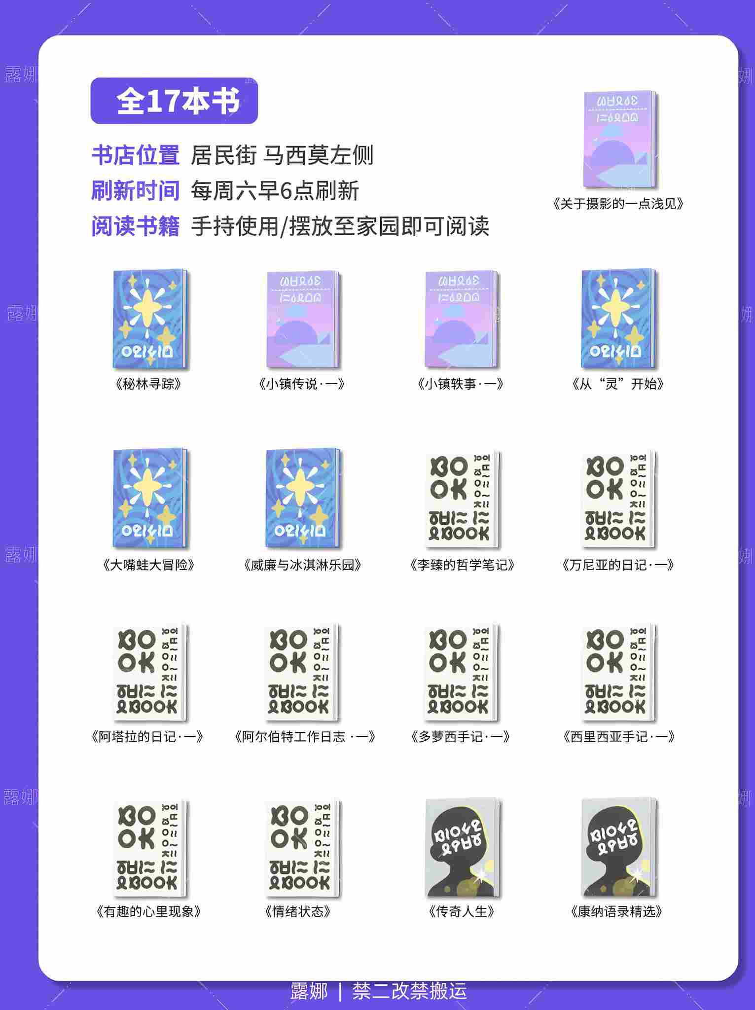 心动小镇手游阅读书籍大全,目前共17本书籍,书店位置在居民街的马西莫左侧,每周六早6点刷新,手持使用/摆放至家园靠近交互就可以阅读书籍,大家都刷到了哪本书呢。
