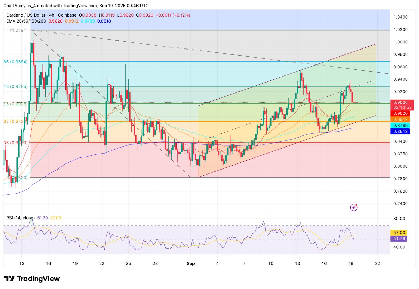 4小时图显示,ADA在上升通道内走势,其上边界限制了0.92美元的涨幅。买家正在捍卫0.90美元至0.89美元之间的EMA集群,该区域一直是短期动能的支点。