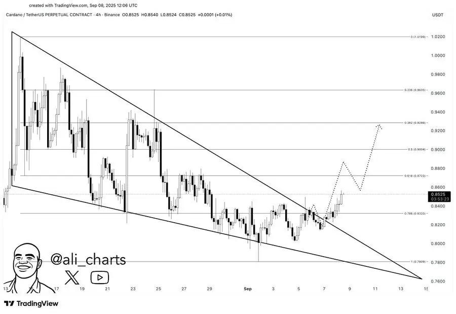 卡尔达诺突破了下降楔形形态,这通常是看涨延续的信号。4小时图上,ADA交易价格接近0.8525美元,多头正在捍卫0.8400美元的水平。该区域曾是阻力位,但现在已成为坚定的支撑位。