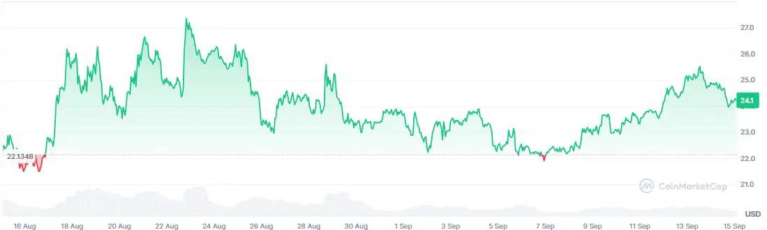 LINK 正在重新走强。该预言机网络代币目前交易价格为24.20–25.20 美元范围取决于交易所。