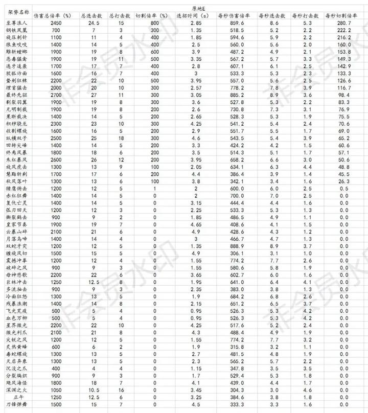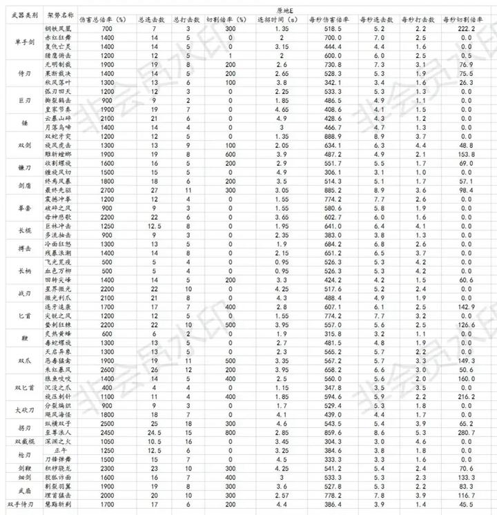 第一张是按照每个武器的各个架势进行对比各项数据,可以在已经确定武器但不知道该选哪个架势的时候参考一下。