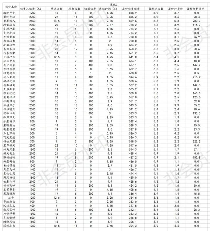 第二张是按照近战所有架势的每秒伤害倍率(DPS)也就是每秒能造成面板多少倍伤害,进行的排序。可以看到,前三名的双蛇牙突,最终先驱,至尊浪人每秒DPS都达到了850%以上,远远甩开后续的架势,也在某种程度上造就了双剑,剑盾和拐刃的强势。当然,这个DPS只是选择武器的一个侧面标准,武器本身的面板还是要优先考虑的。就算是架势DPS 1w,但是面板不行,伤害表现一样是不行。(哦好像如果DPS到了每秒10000%,伤害可能还是可以的)