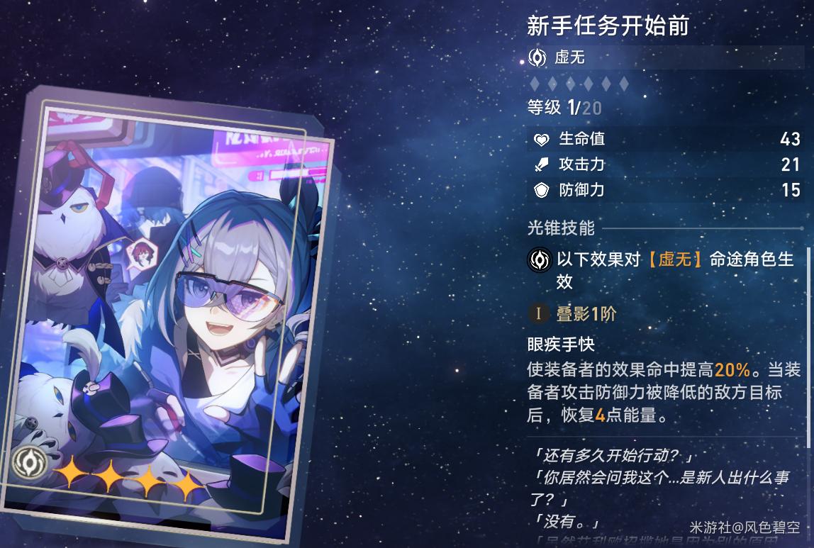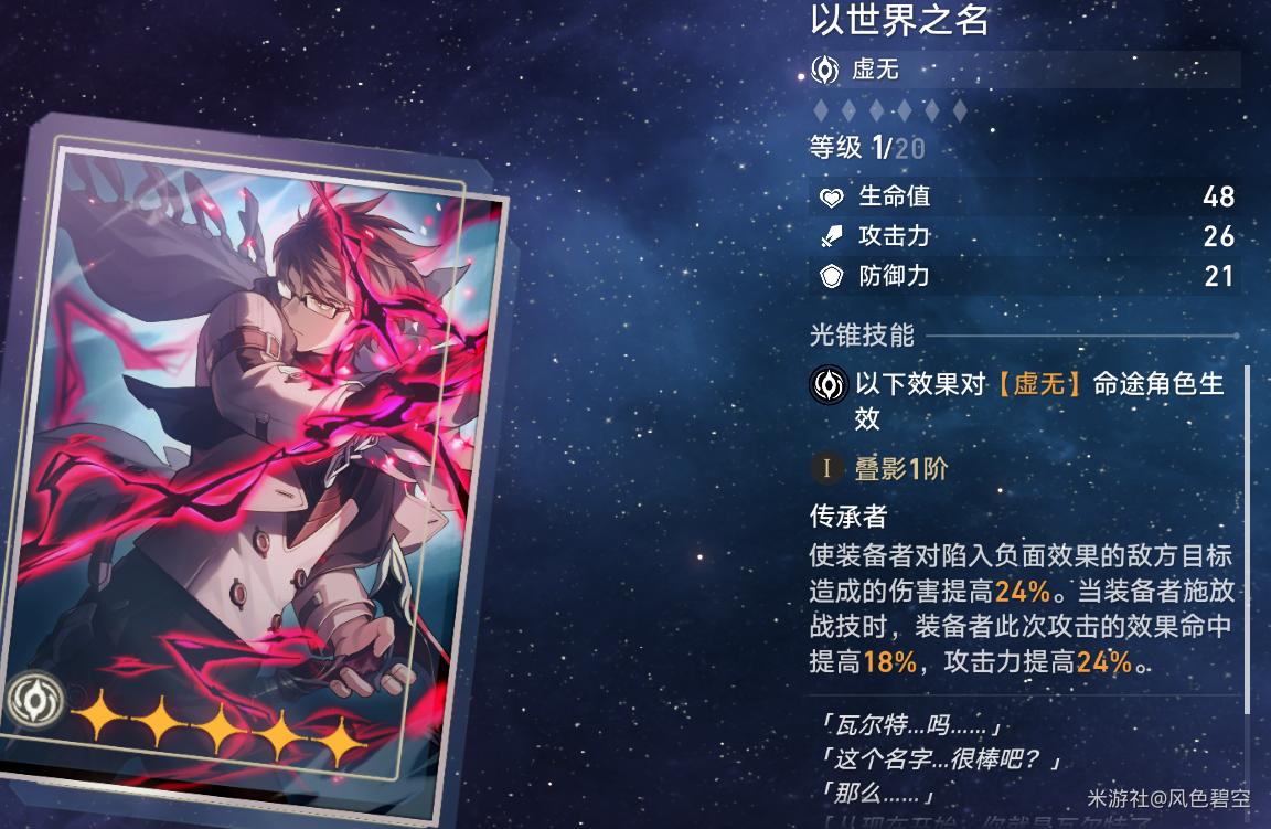 V1.1版本的活动赠送光锥,参照原神的活动武器,活动结束后应该就绝版了。这个光锥常态提供大量效果命中(满叠影40%),同时如果银狼攻击防御力降低状态的敌人,可以回复能量,加快终结技循环流程,搭配银狼终结技和天赋的减防缺陷效果,覆盖率非常高,且作为活动光锥是可以免费获取满叠影的。可以说0星魂银狼的毕业武器。