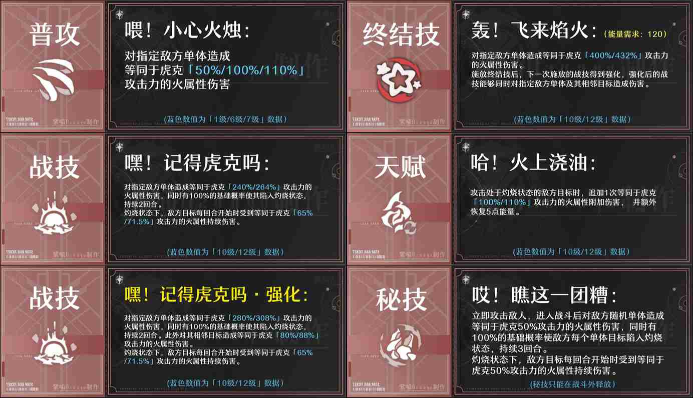 虎克的战技是虎克的核心技能,分成普通战技和强化战技两种模式。两种模式的共同点在于能给选中的敌人施加灼烧状态(能被抵抗),灼烧能够配合虎克的天赋增加虎克的伤害和加速循环。两种模式的区别在于,普通战技是单攻攻击,强化战技除了倍率提高以外,还变成了扩散攻击,获得对群能力。这里要注意的是,扩散的目标不会附加战技的灼烧,但是是可以削韧的。