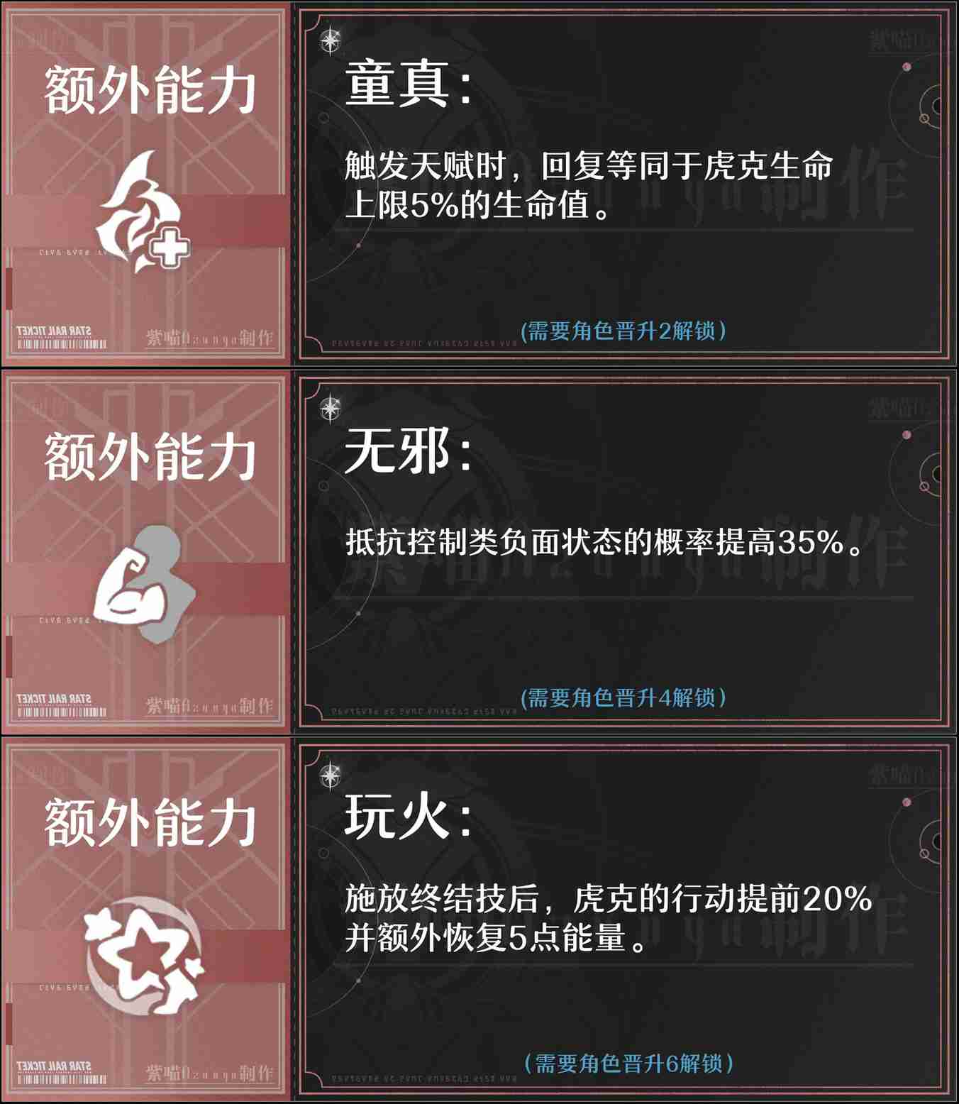 这个被动可以加快虎克的技能循环。不过要注意的是行动提前是立刻生效的效果,所以如果我们在虎克的回合中插入终结技,这个行动提前是等同于无效的,我们尽量在其他队友行动时释放虎克的终结技比较好。