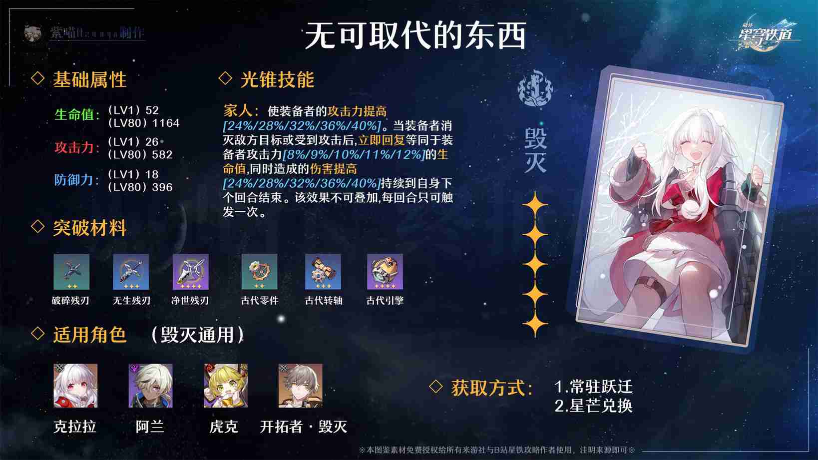 作为印有克拉拉头像的五星光锥,被称为克拉拉的专武,是目前最优质的毁灭光锥。能提供常驻攻击力加成,并且还提供了恢复生命值的生存能力,让虎克对治疗的需求再次下降。被敌人攻击或者击杀敌人还能获得增伤收益。但是由于其没有不可替代性,所以有的话可以用,不建议特地去商城兑换。