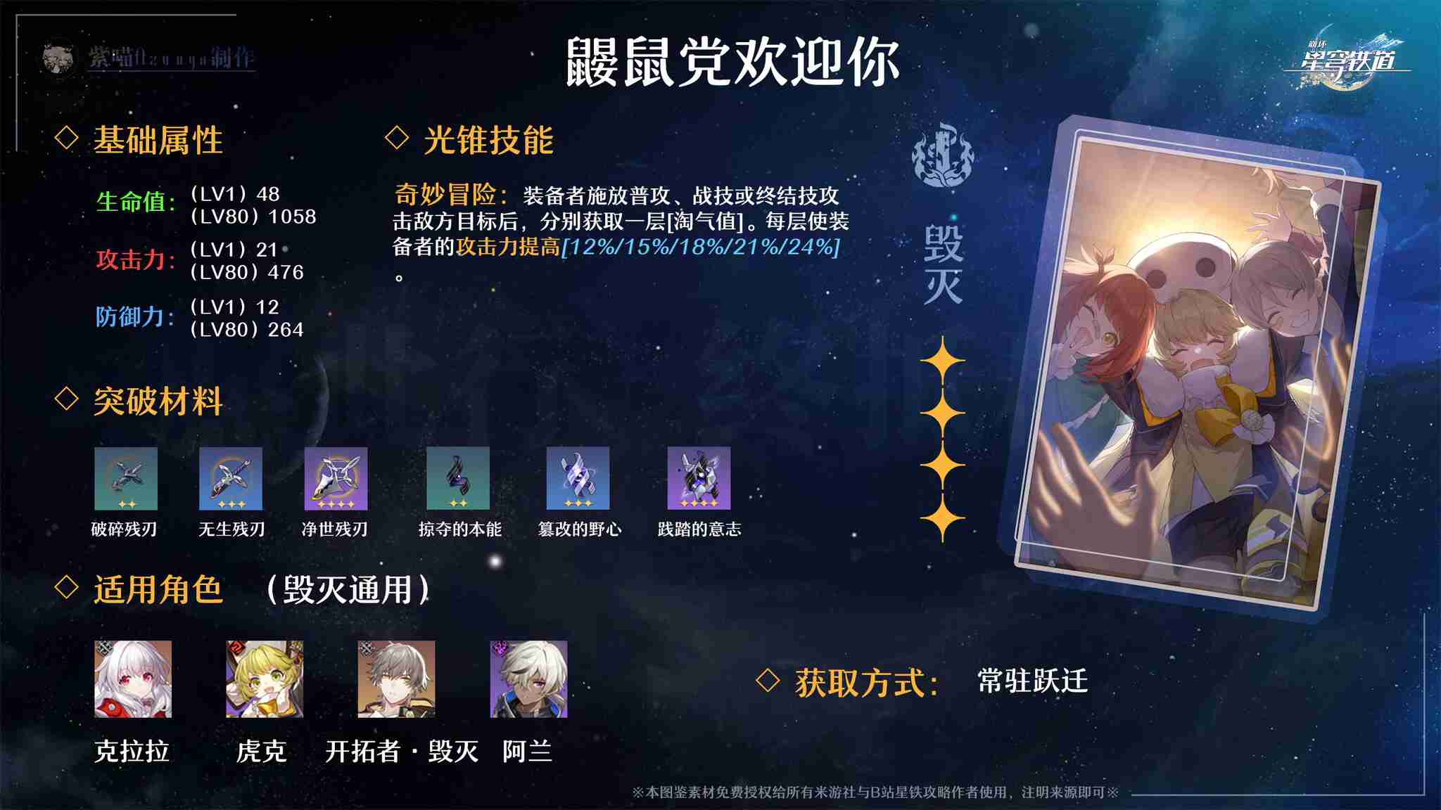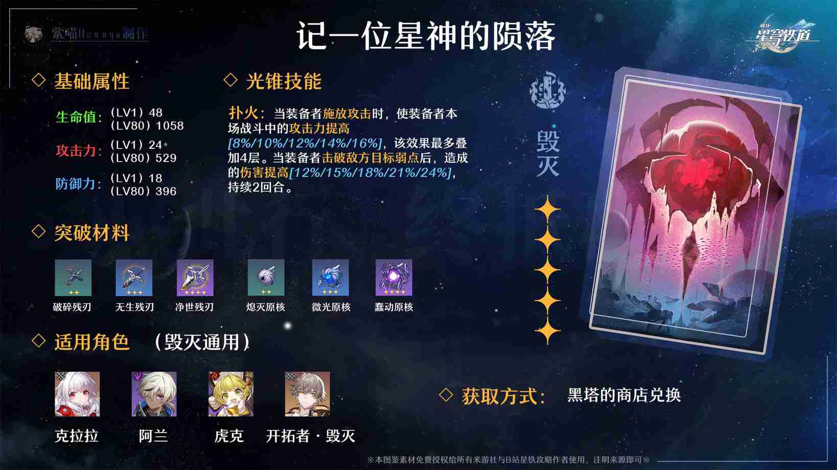这个光锥可以在游戏中免费获得,常态提供攻击力加成,并且提供对虎克来说基本等同于常驻的增伤收益。非常适合虎克使用。