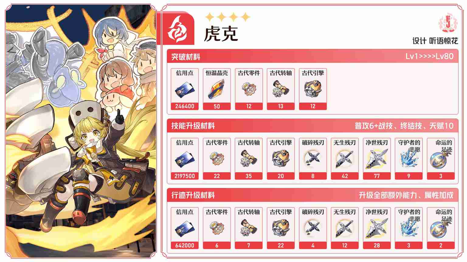 v1.0版本常驻四星毁灭「虎克」,是一个还算可以的输出位,自身的机制可以自恰,哪怕是没有队友也可以自我满足需求,强度上建议当前版本非常需要火C的人培养,否则不建议培养。