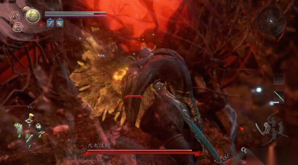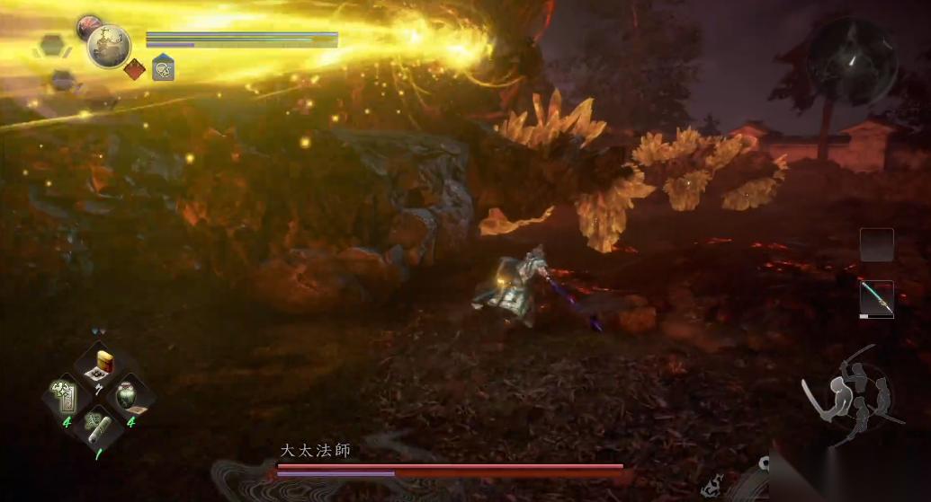 常暗状态下它的攻击频率显著提高,如连续发射激光和频繁投石,玩家需保持移动、调整站位,以攻击不同位置的晶体。若晶体位置较高,可趁攻击间隙通过跳跃或走位接近。注意,迟钝符与封力符对大太法师无效,因此建议将符咒用于强化自身,如使用召火符提升攻击、金刚符加强防御,并配备精力恢复药水以维持输出能力。