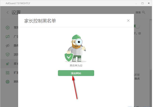 5、在弹出的窗口中,点击"添加网站"按钮。添加到黑名单中的网站,孩子是无法看的。