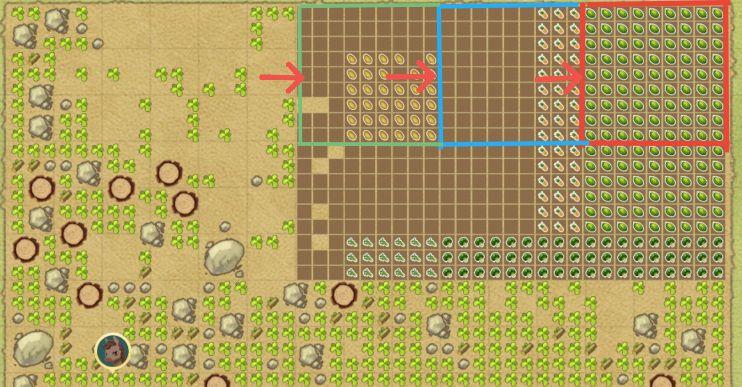 牧场格局:牧场土地由45×30=1350格子组成,以3×3=9个格子组成一块地,整个牧场有150块田。以一个秘银水壶的浇灌范围(81格,计9块田)为一个秘银垄(三测数据)