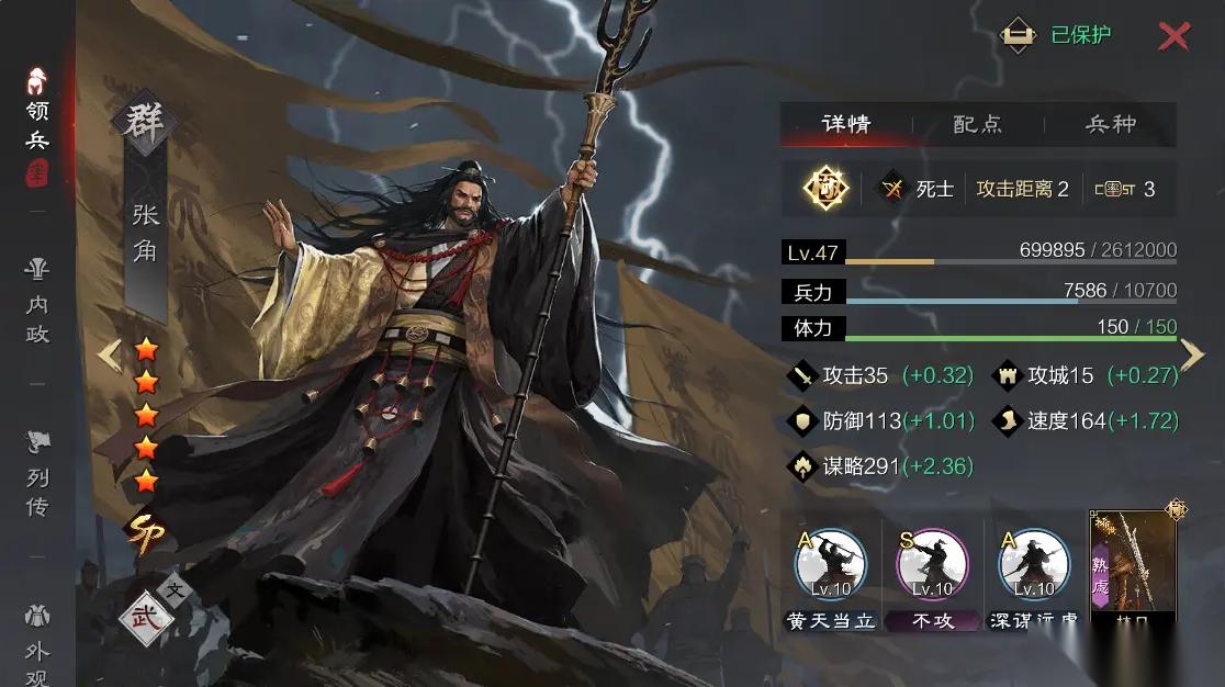 兵种选择上,SP张角通常转为轻骑兵以提升速度属性,确保先手释放战法,而普通张角同样依赖速度但更需兼顾生存。特性推荐乱阵和疾行,前者增强对步兵的克制,后者优化出手顺序。SP张角的技能组合更灵活,可搭配深谋远虑风声鹤唳等战法强化输出,而普通张角则依赖不攻或楚歌四起弥补攻击距离短板。