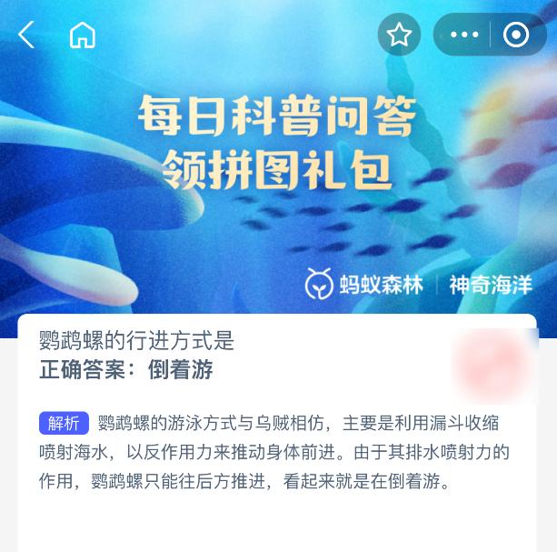 鹦鹉螺的行进方式是?【神奇海洋每日一题】2025年9月25日新题已上线!正确答案已公布,选出即可领取海洋拼图奖励,助力修复海域生态!今日正确答案是:【倒着游】,鹦鹉螺的游泳方式是利用反作用力来推动身体前进。由于其排水喷射力的作用,鹦鹉螺只能往后方推进,看起来就是在倒着游。