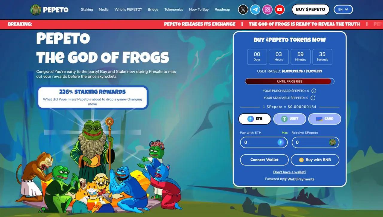 尽管 BlockDAG 在规模上胜出,Pepeto价格实惠,文化底蕴深厚。Pepeto 售价仅为 0.000000155 美元,它融合了 meme 驱动的上涨潜力、226% 的质押奖励,以及与加密货币领域最大的 meme 品牌之一 Pepe 竞争的精彩故事。