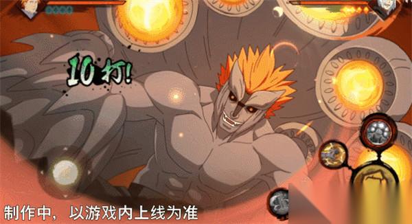 忍战重吾释放奥义:多莲不自连炮时会完成咒印化,先踏地攻击敌人随后突进抓取,将敌人按在地面拖行并持续攻击,随后忍战重吾改变自身细胞形状,在零距离下发射大量压缩过的查克拉炮弹将敌人终结!