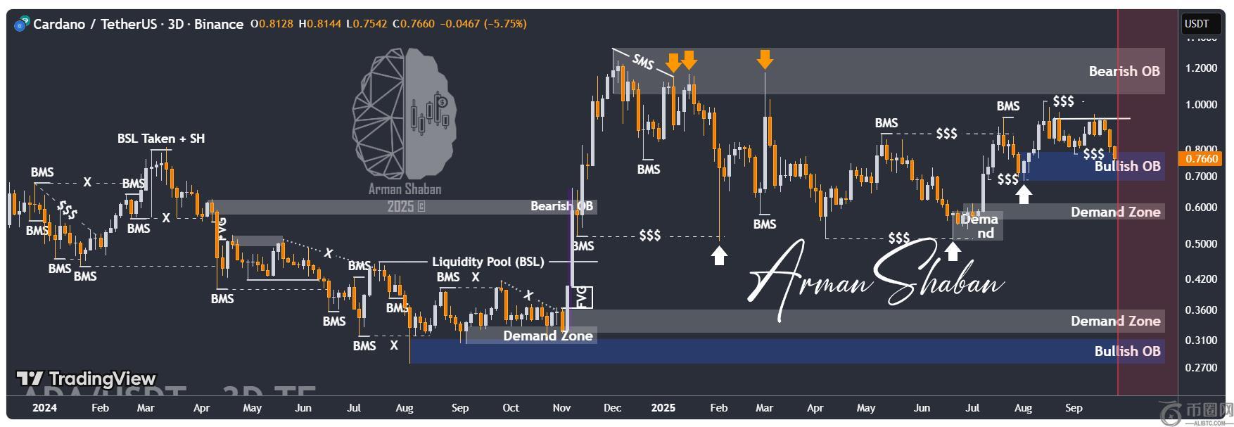 随后价格出现反弹,持续上涨至8月底9月初,当时ADA价格在1.00美元附近遇到阻力。然而,卖方重新掌控局面,并将卡尔达诺拉回至0.68美元至0.78美元的需求区域,目前交易价格也位于该区域。这也代表了之前的看涨订单区块。