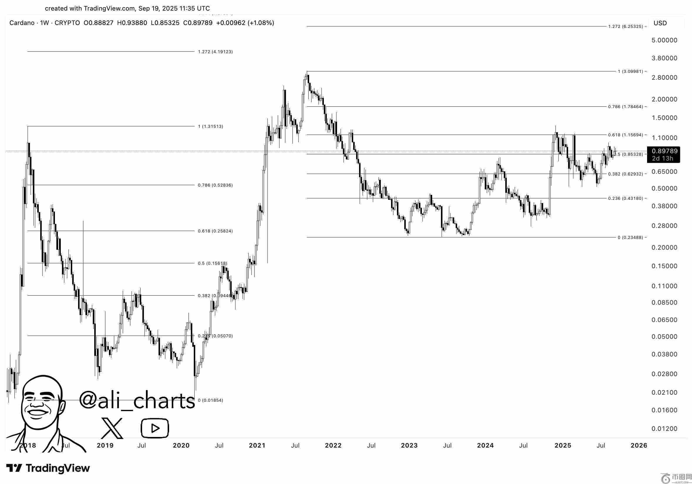 为了从长期来看,马丁内斯也看好,此前指向卡尔达诺在过去周期中的表现。 他指出,ADA 在 1.272 斐波那契扩展处达到峰值然后如果历史重演,本轮周期其价格可能达到 3 至 6 美元之间。