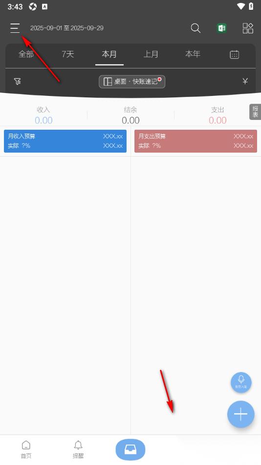1.当我们将手机上的逸记APP点击打开之后,选择底部的【快账】选项,然后在页面上方点击【三】。