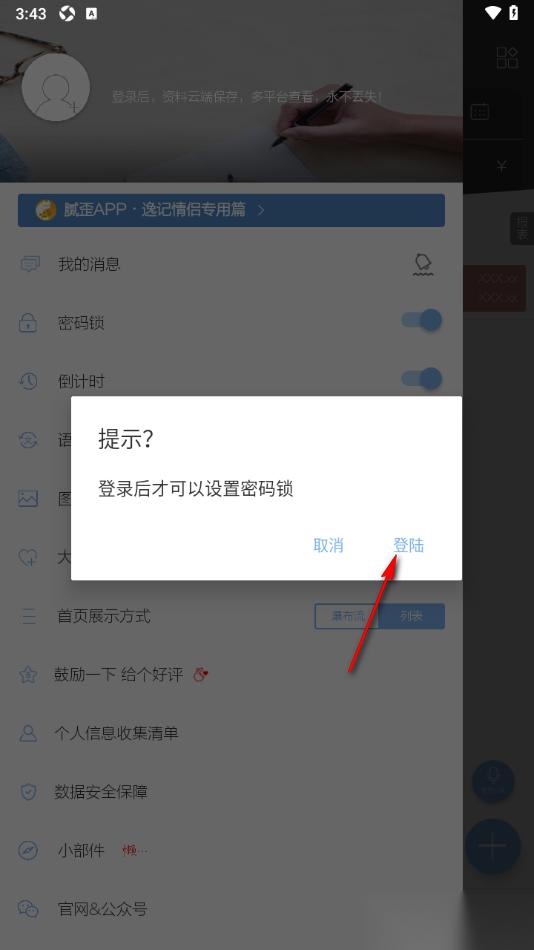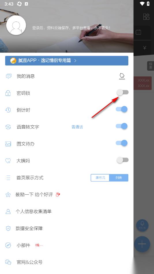逸记APP是一款功能十分强大的记账、编辑日记设置提醒等多种实用功能集于一体的服务软件,对于家庭用户来说是非常有帮助的,由于该软件中编辑的账单数据以及日记、身份证等相关信息属于隐私数据,因此不方便给其他人查看,为了防止相关数据泄露的情况,用户可以将该软件的密码锁功能开启,那么每次打开该软件查看内容时需要输入所设置的密码才能打开查看,因此别人无法轻易的使用该软件,直接打开左侧边栏窗口,找到密码锁即可启用,快来和一起看看下方操作的步骤教程吧。
