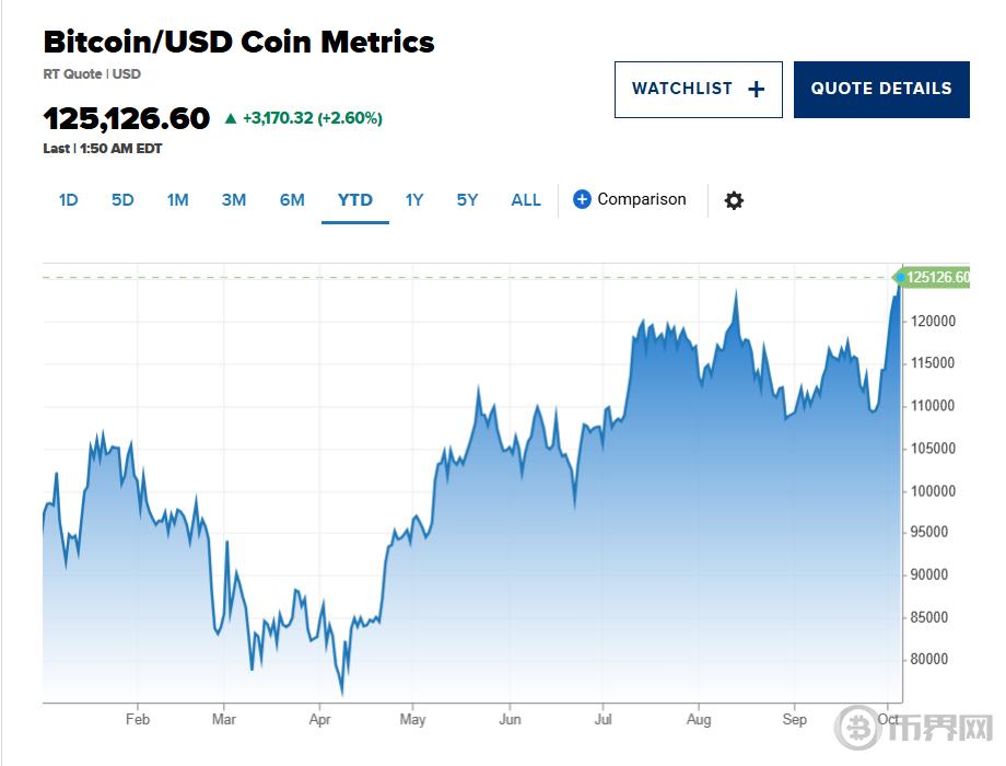 全球最大加密货币周日(10月5日)在亚洲交易时段最高触及125,689美元,超越此前8月14日创下的124,514美元纪录。比特币此次上涨得到美股上涨和比特币相关交易所交易基金资金流入的支撑。