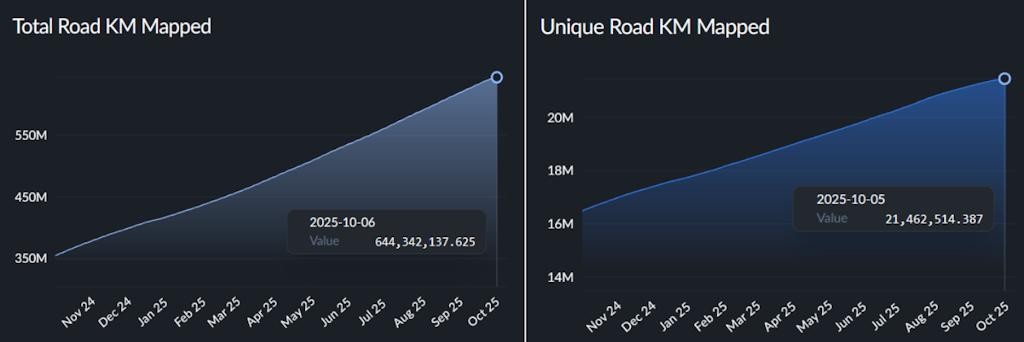 根据Hivemapper官方数据,该网络已累计绘制了6.44亿公里的道路,其中包括2100万公里的独特道路。
