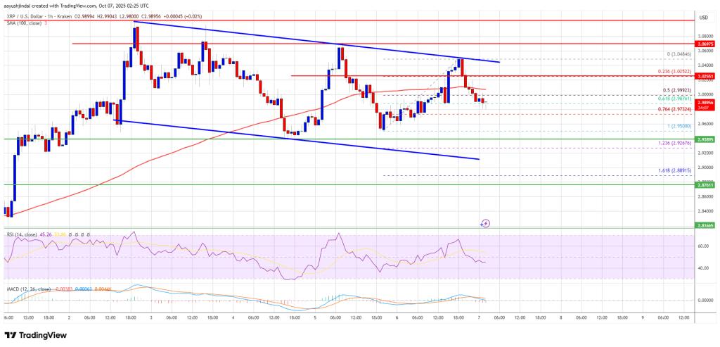 XRP 价格难以维持在 3.020 美元和 3.050 美元上方。目前价格正在巩固涨幅,并可能向下回调至 2.920 美元区域。